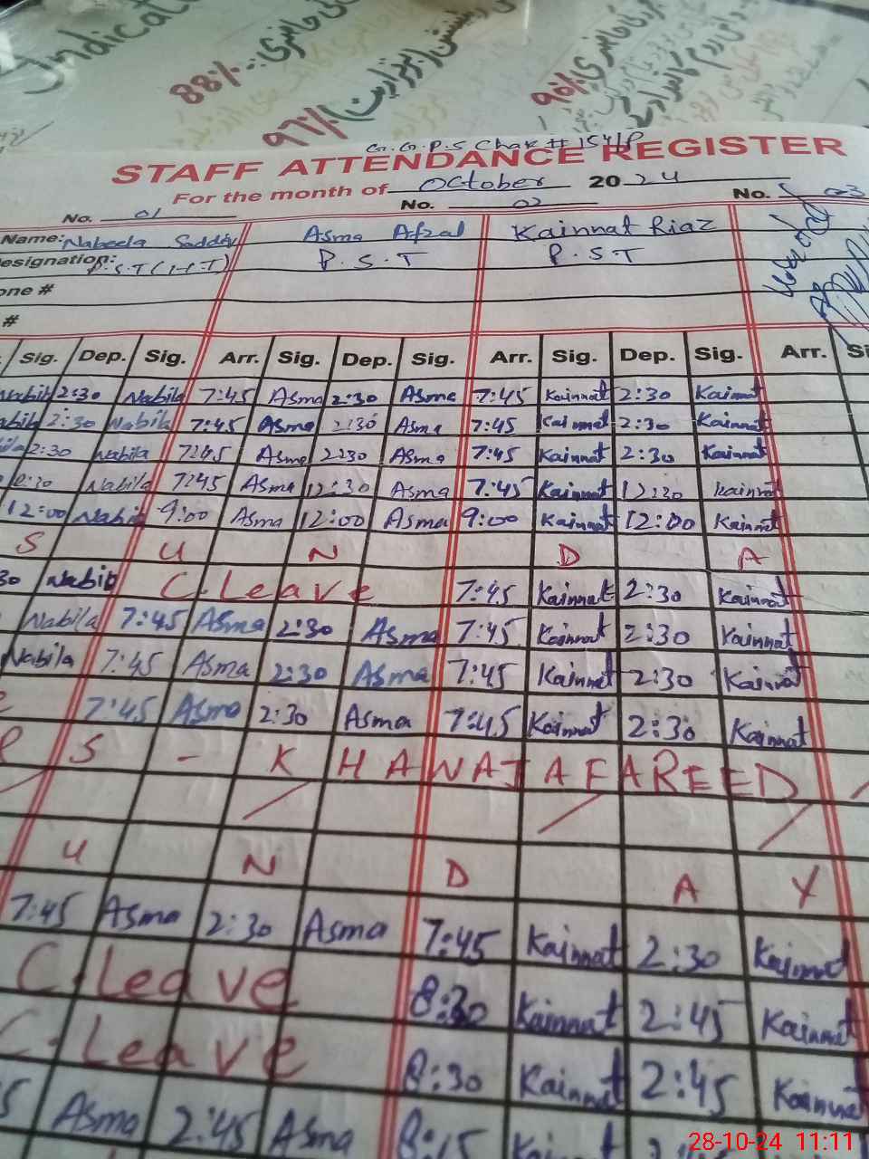| CNIC | Full Name | Designation | R/C | Absence During Last Calender Month |