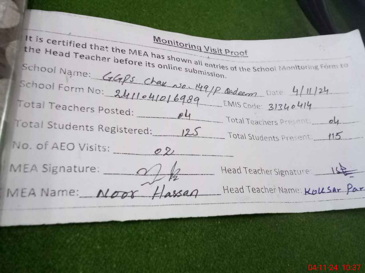 | Attendance Register | Head Teacher | MEA with School | Visit Proof |