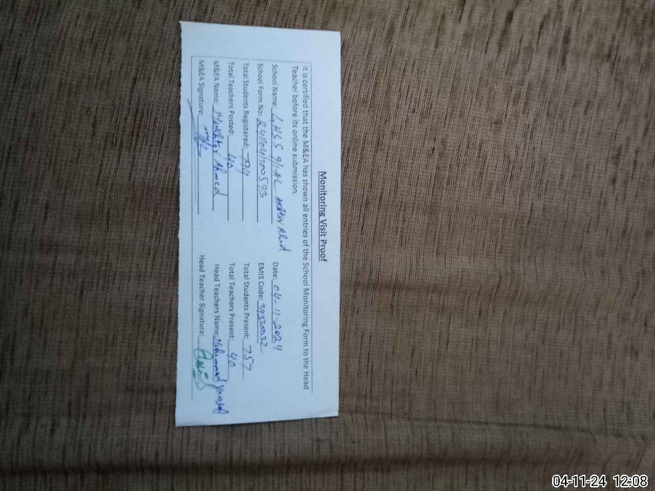 | Attendance Register | Head Teacher | MEA with School | Visit Proof |