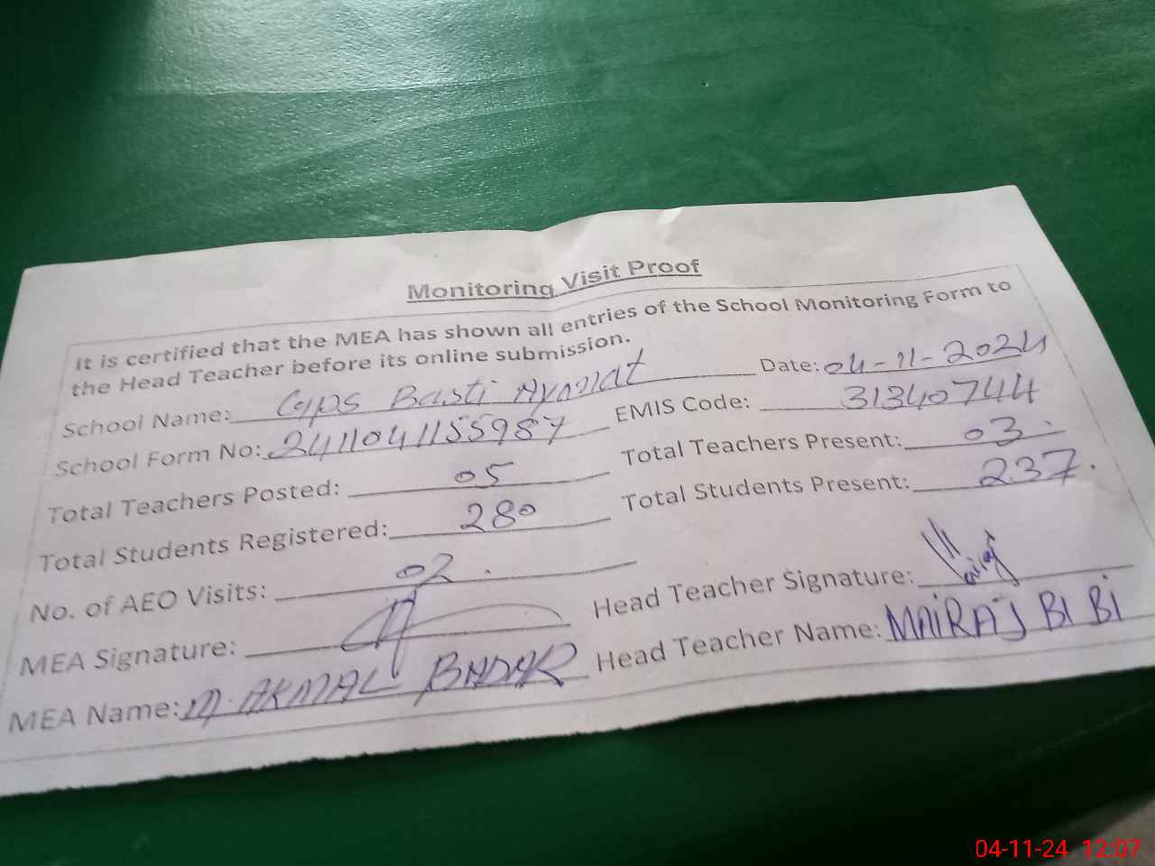 | Monitoring Date: 04-11-2024 | Start Time: 04-11-2024 11:55 AM | End Time: 04-11-2024 12:18 PM | Name of MEA: Mu**** Ak**** Ba**** | |