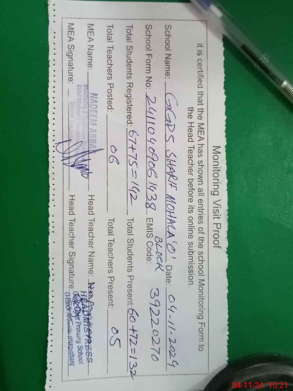 | Attendance Register | Head Teacher | MEA with School | Visit Proof |