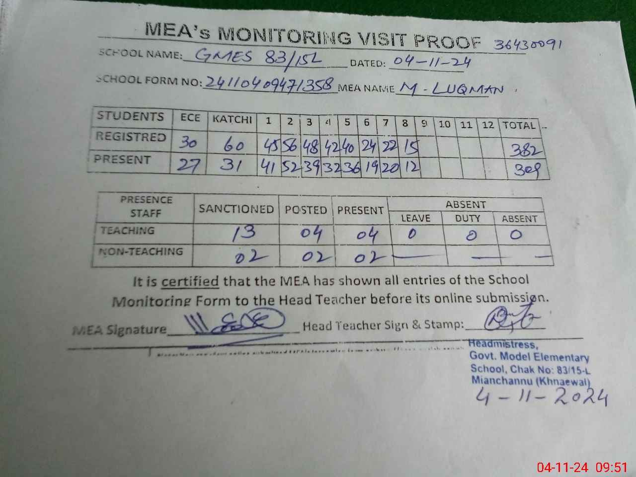 | Attendance Register | Head Teacher | MEA with School | Visit Proof |