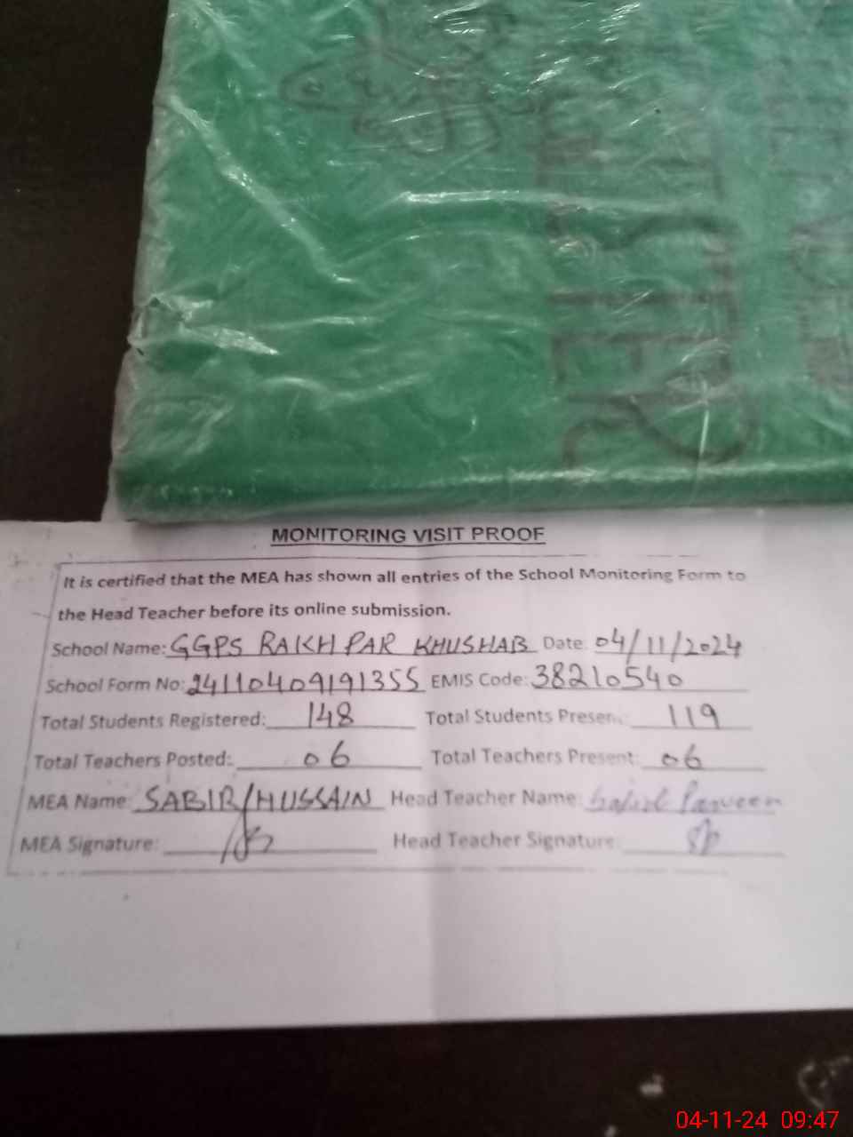 | Attendance Register | Head Teacher | MEA with School | Visit Proof |