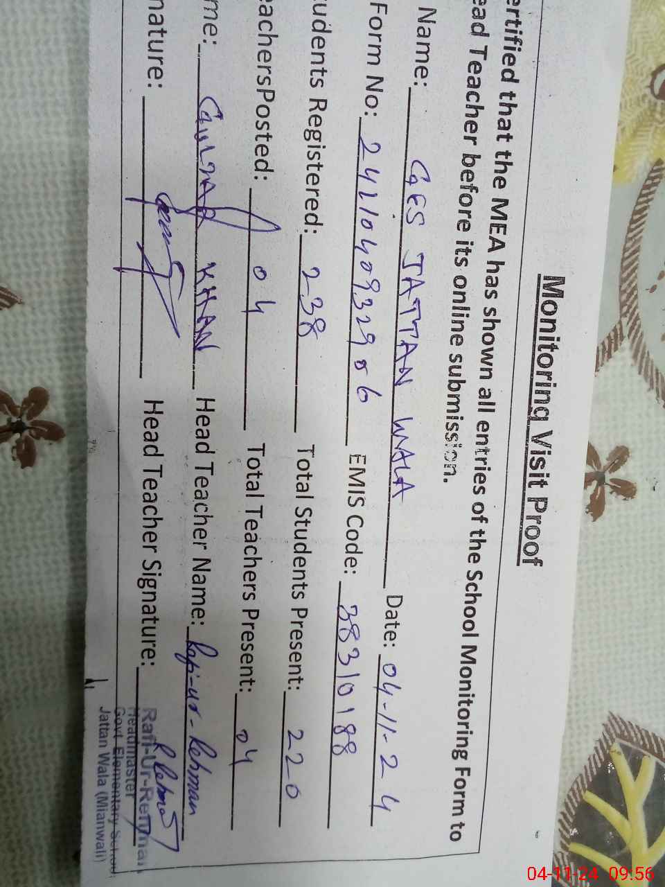 | EMIS Code: 38310188 | Name of School: GES JATTAN WALA | |||