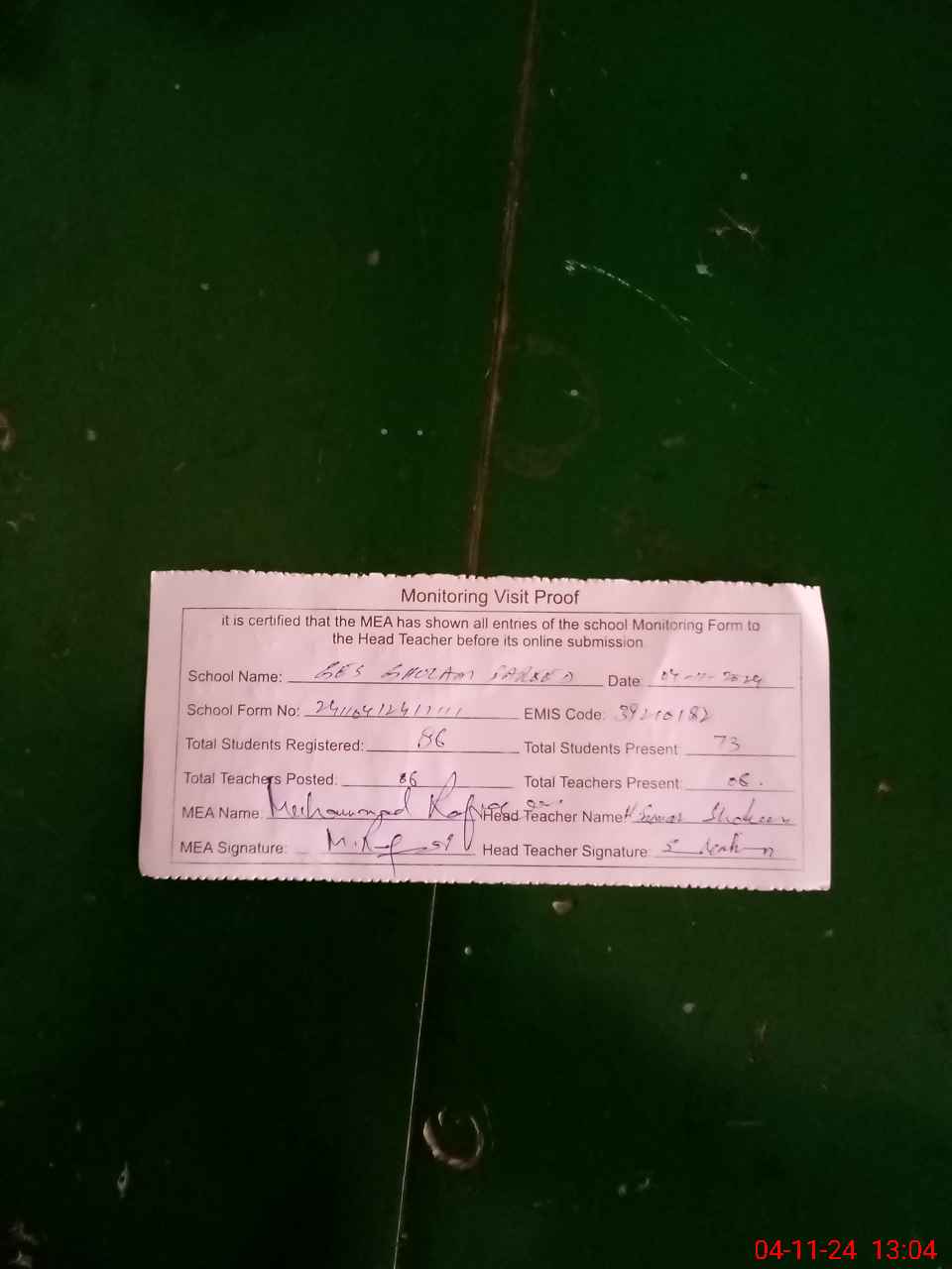 | Attendance Register | Head Teacher | MEA with School | Visit Proof |