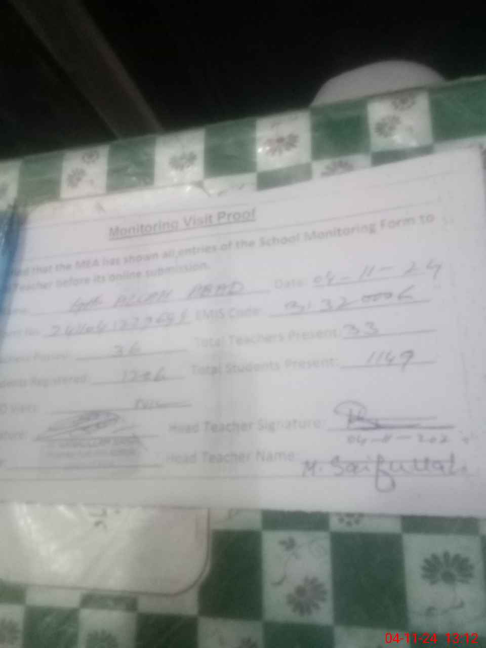 | Attendance Register | Head Teacher | MEA with School | Visit Proof |