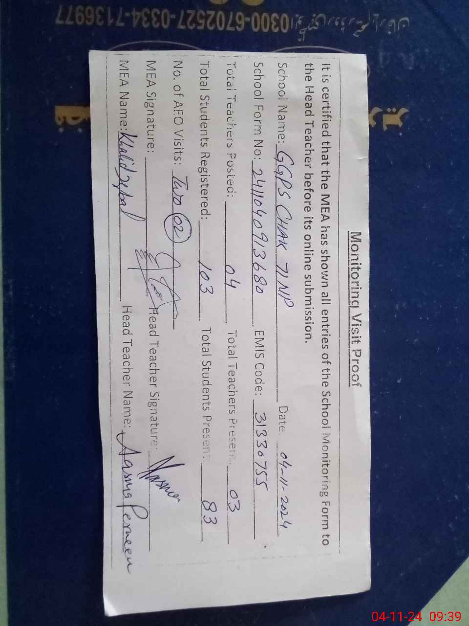 | Attendance Register | Head Teacher | MEA with School | Visit Proof |