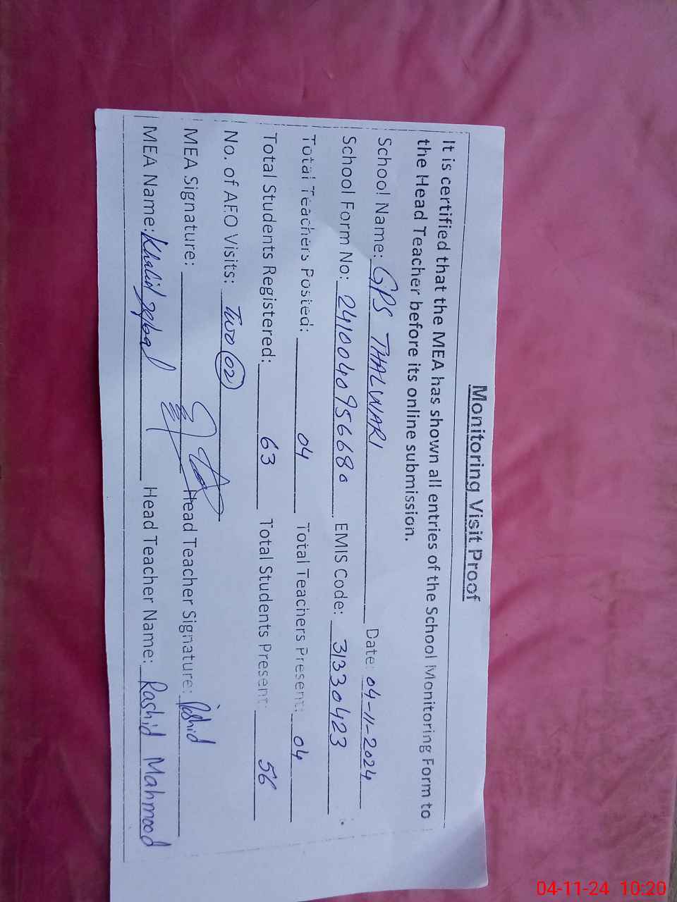 | Attendance Register | Head Teacher | MEA with School | Visit Proof |