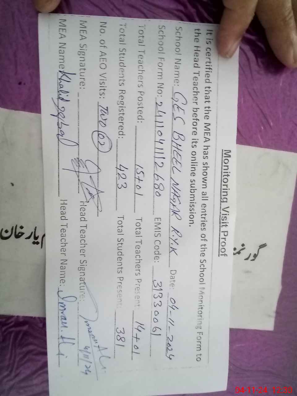 | EMIS Code: 31330061 | Name of School: GES BHEEL NAGAR RAHIM YAR KHAN | |||