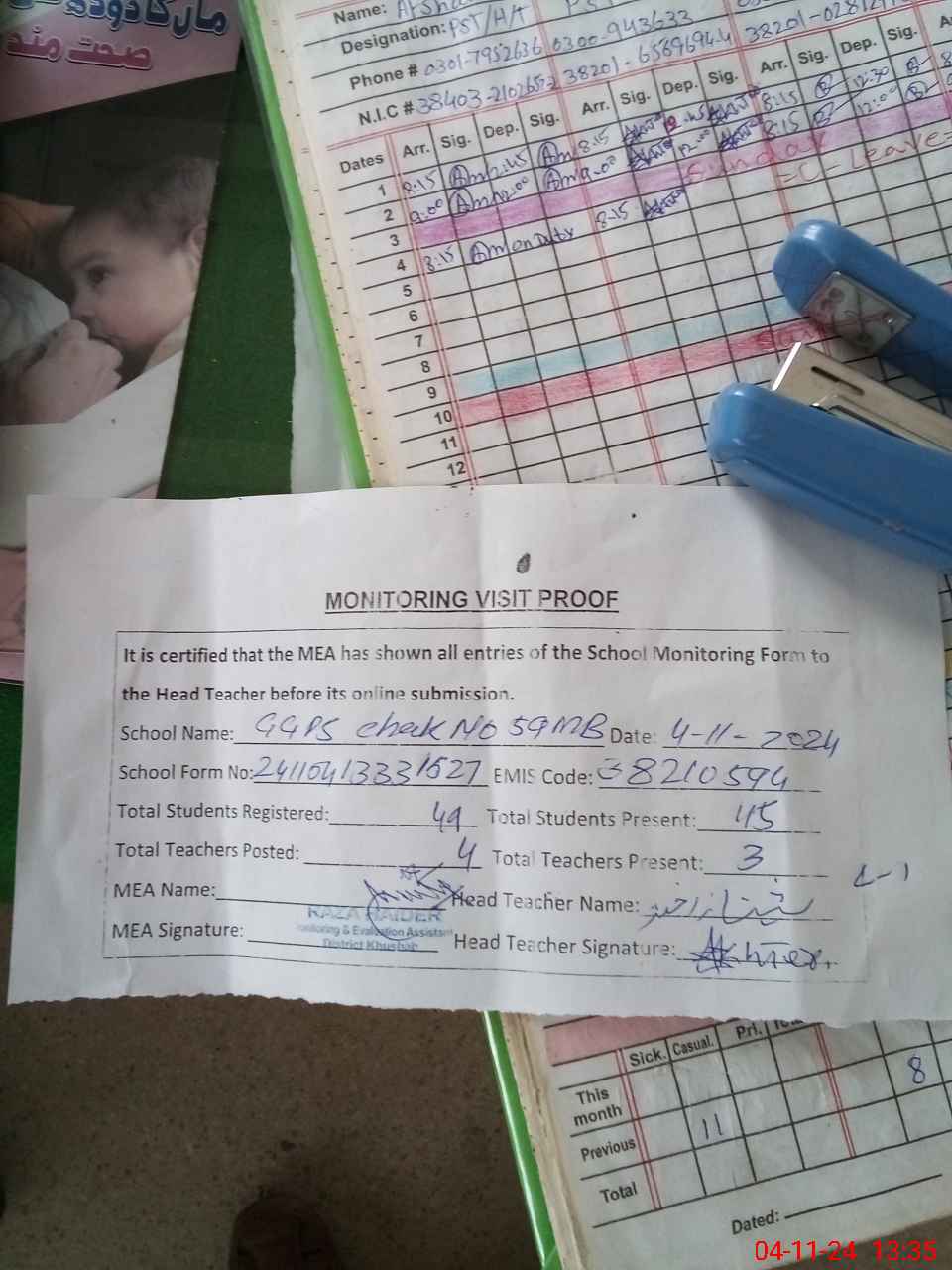 | Attendance Register | Head Teacher | MEA with School | Visit Proof |