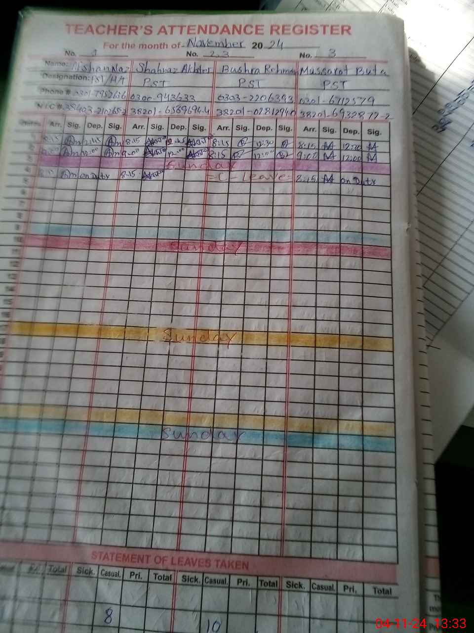 | CNIC | Full Name | Designation | R/C | Absence During Last Calender Month |