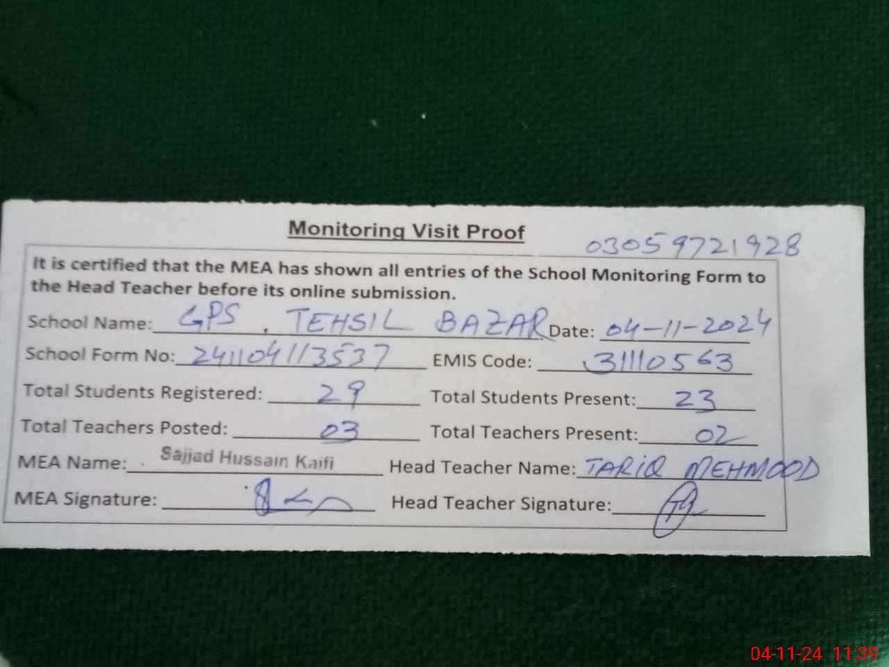 | Attendance Register | Head Teacher | MEA with School | Visit Proof |