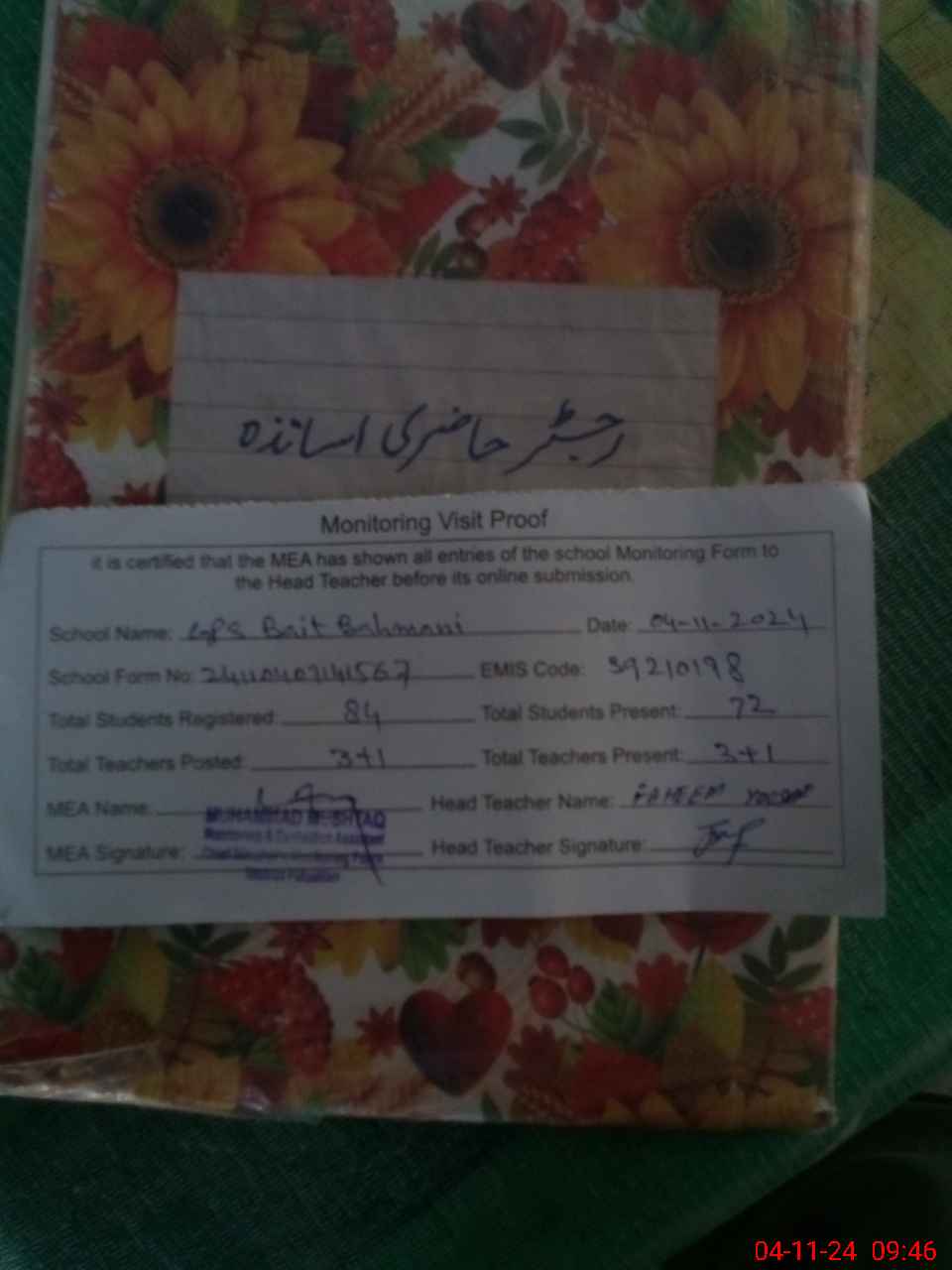 | Attendance Register | Head Teacher | MEA with School | Visit Proof |