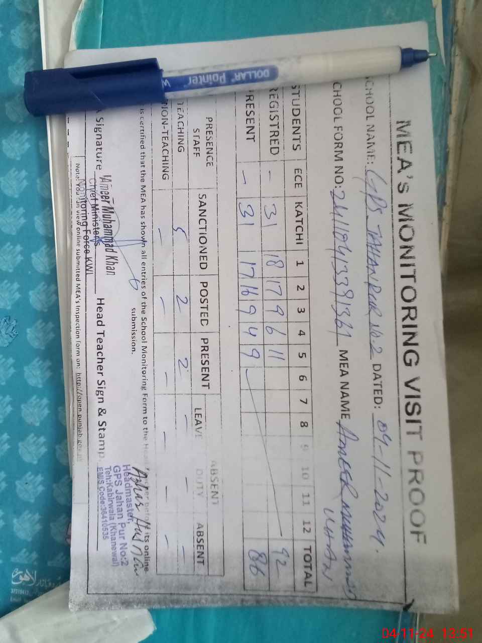 | EMIS Code: 36410535 | Name of School: GPS JAHAN PUR NO.2 P/O NOOR PUR, KABIRWALA | |||