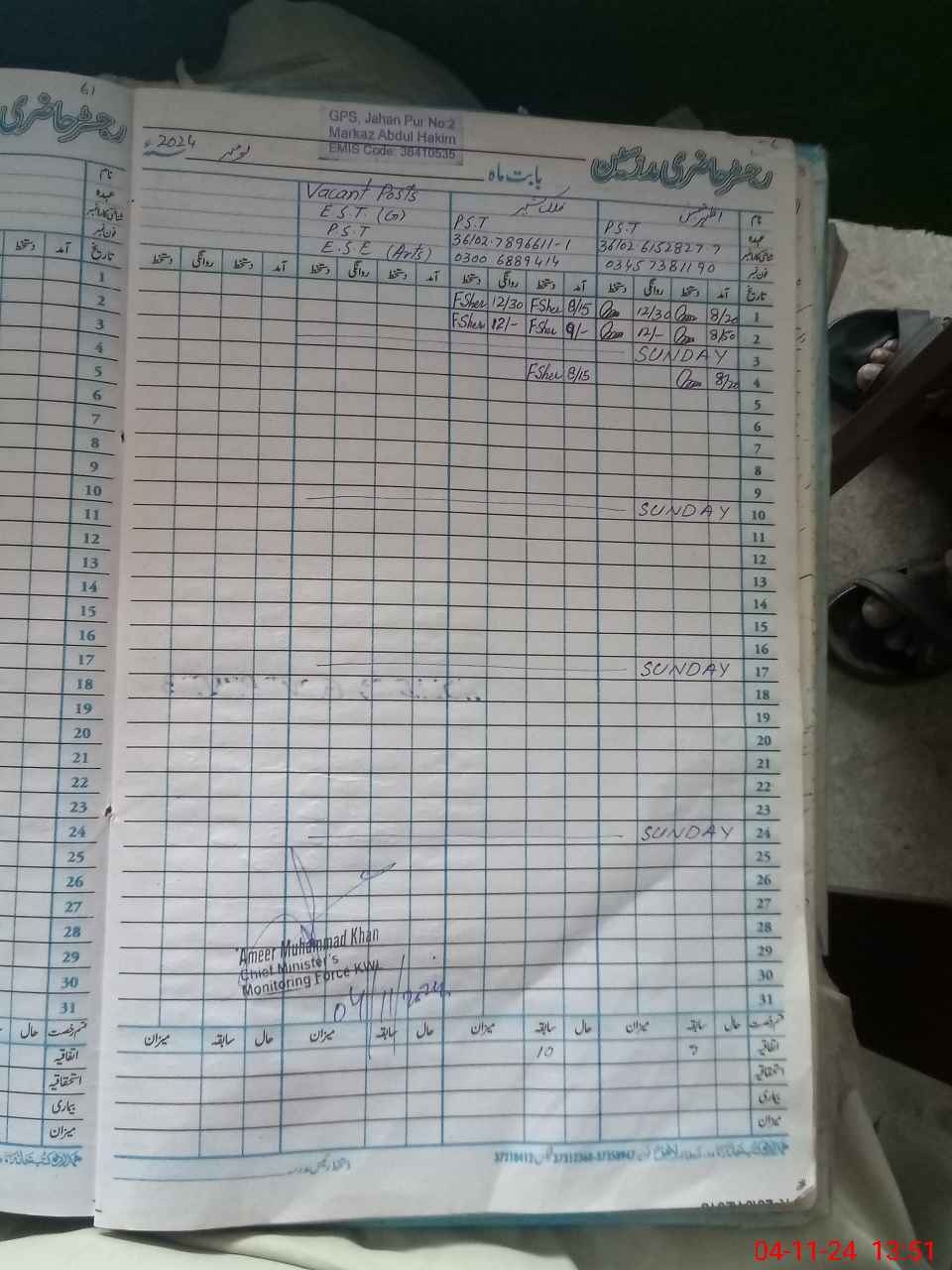 | Name: Az**** Hu**** Designation: (School Headmaster's/Headmistress's) PST Phone/Cell Number: 03**** |