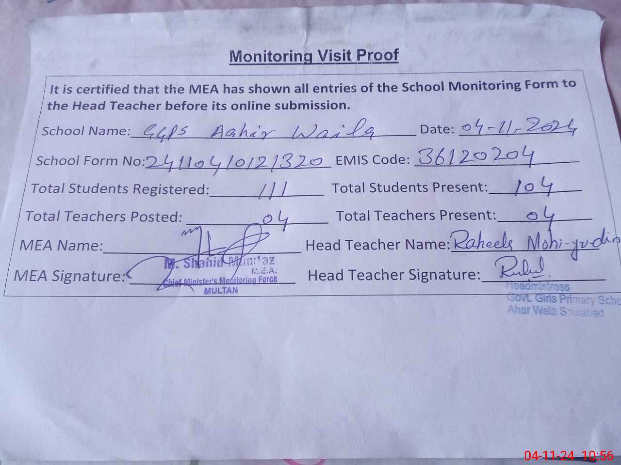 | Attendance Register | Head Teacher | MEA with School | Visit Proof |