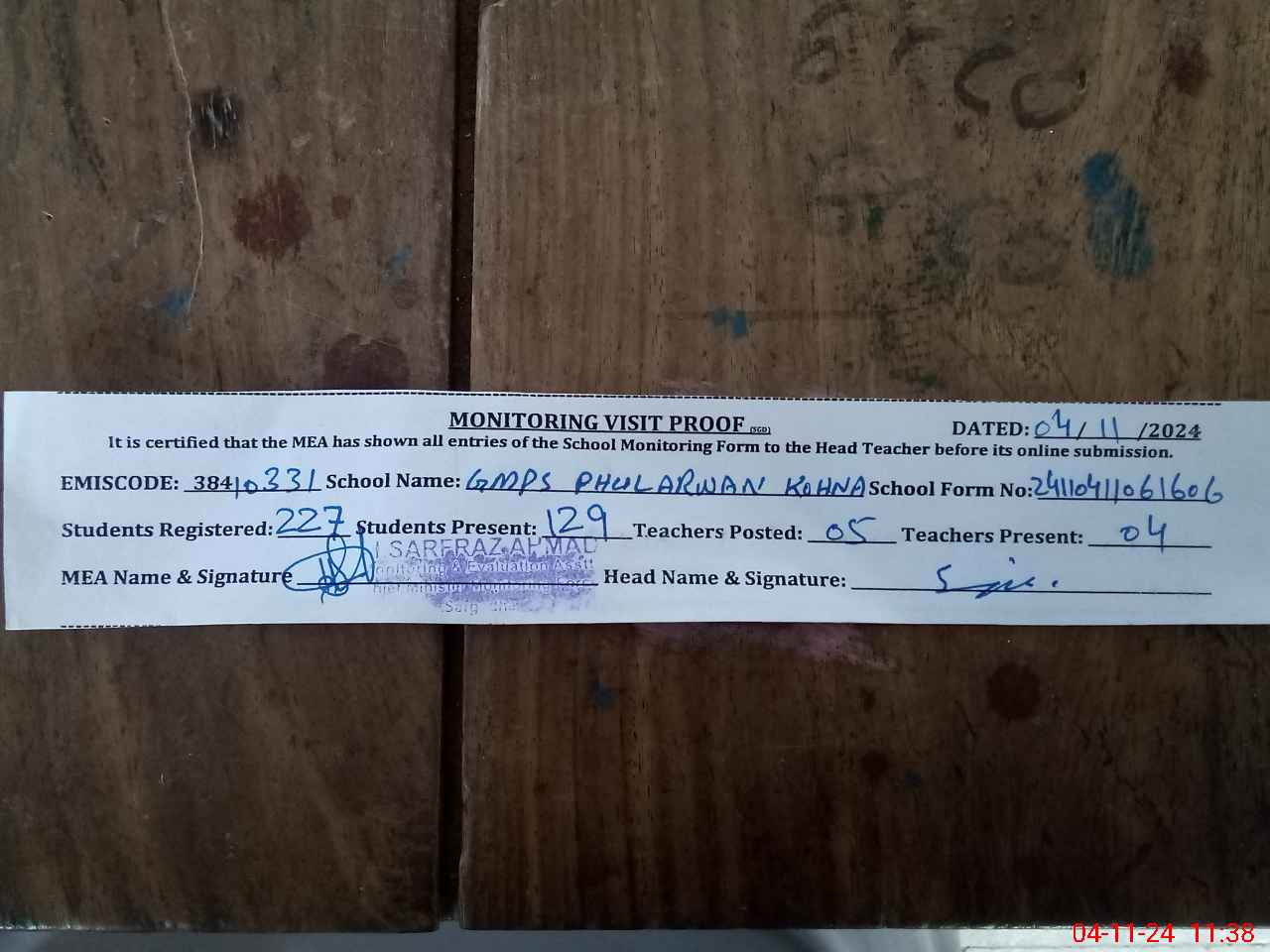 | Attendance Register | Head Teacher | MEA with School | Visit Proof |