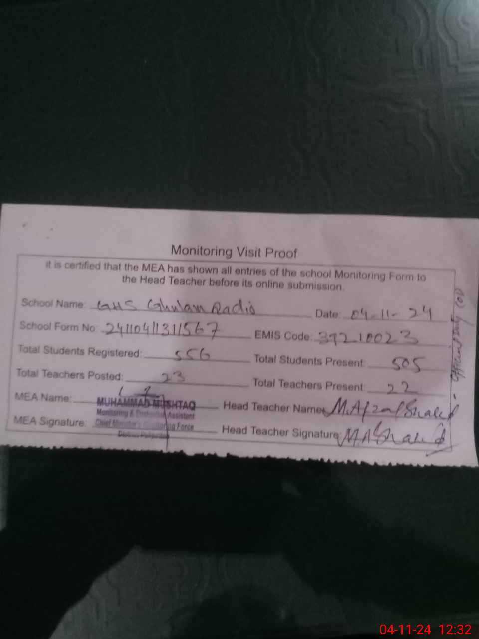 | Attendance Register | Head Teacher | MEA with School | Visit Proof |