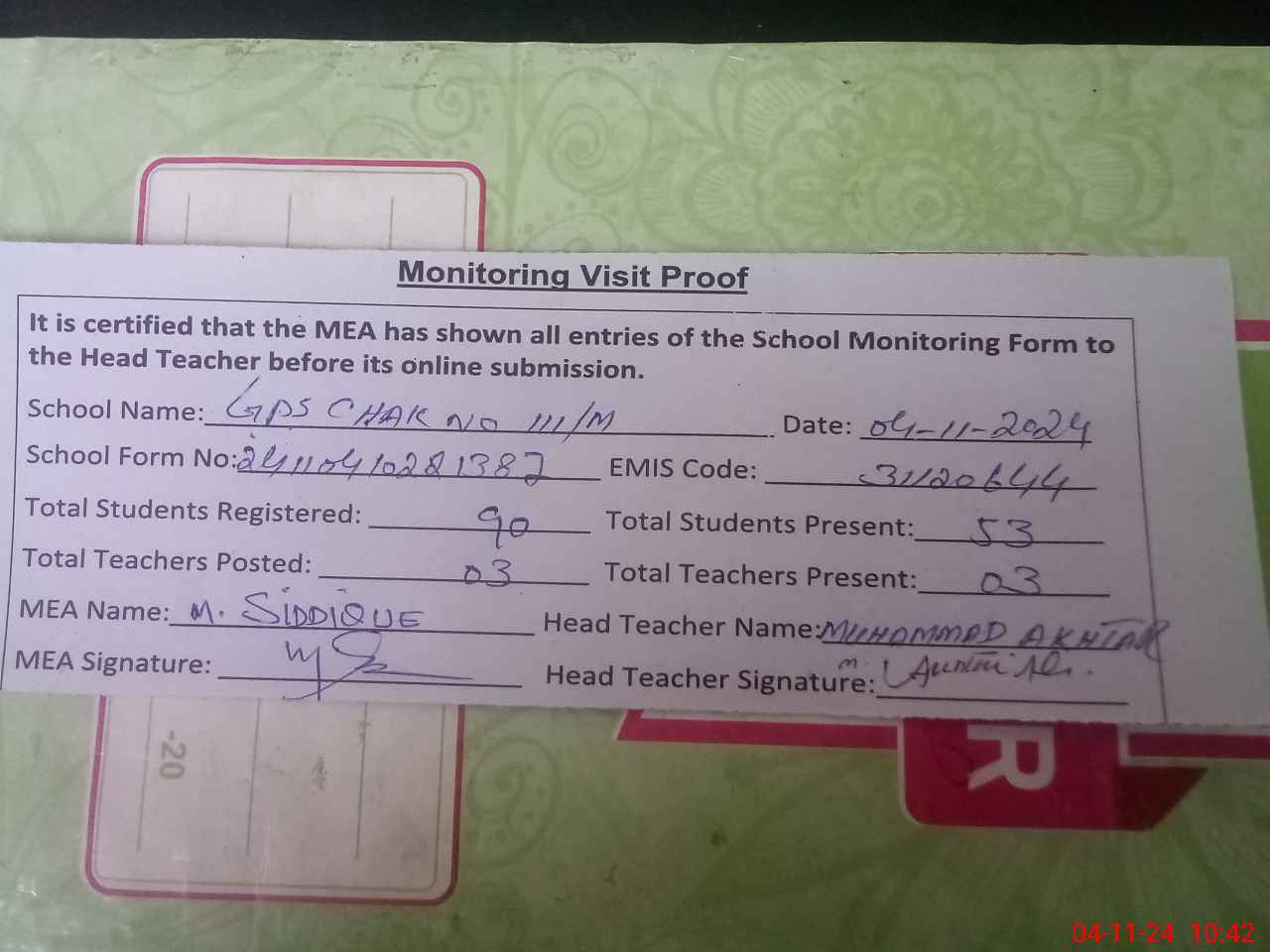 | EMIS Code: 31120644 | Name of School: GPS CHAK 111/M | |||