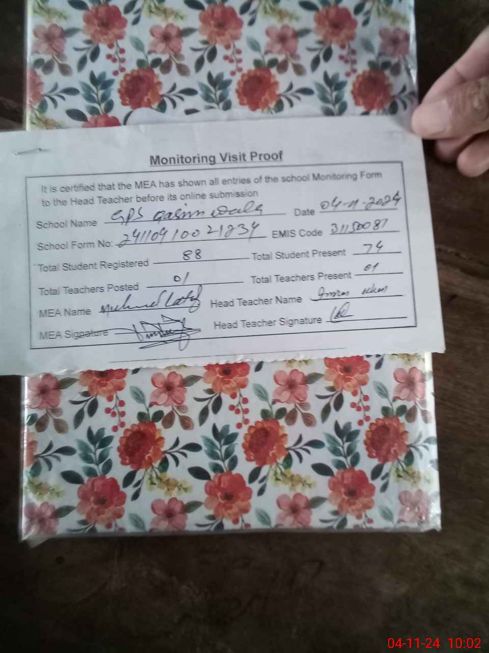 | Attendance Register | Head Teacher | MEA with School | Visit Proof |