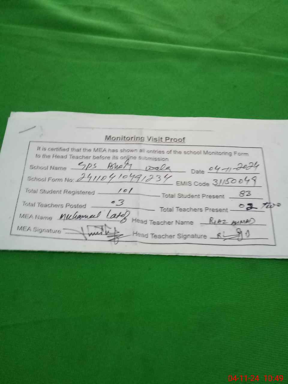 | EMIS Code: 31150049 | Name of School: GPS BHOLEY WALA | |||