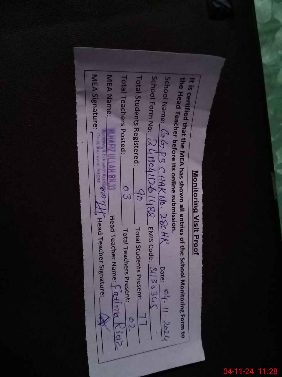 | EMIS Code: 31130345 | Name of School: GGPS CHAK NO 280 HR | |||