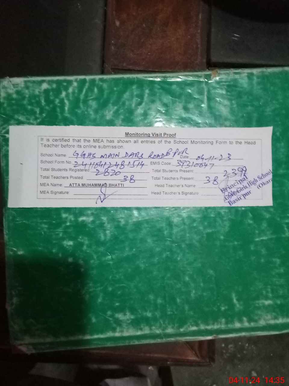 | Attendance Register | Head Teacher | MEA with School | Visit Proof |