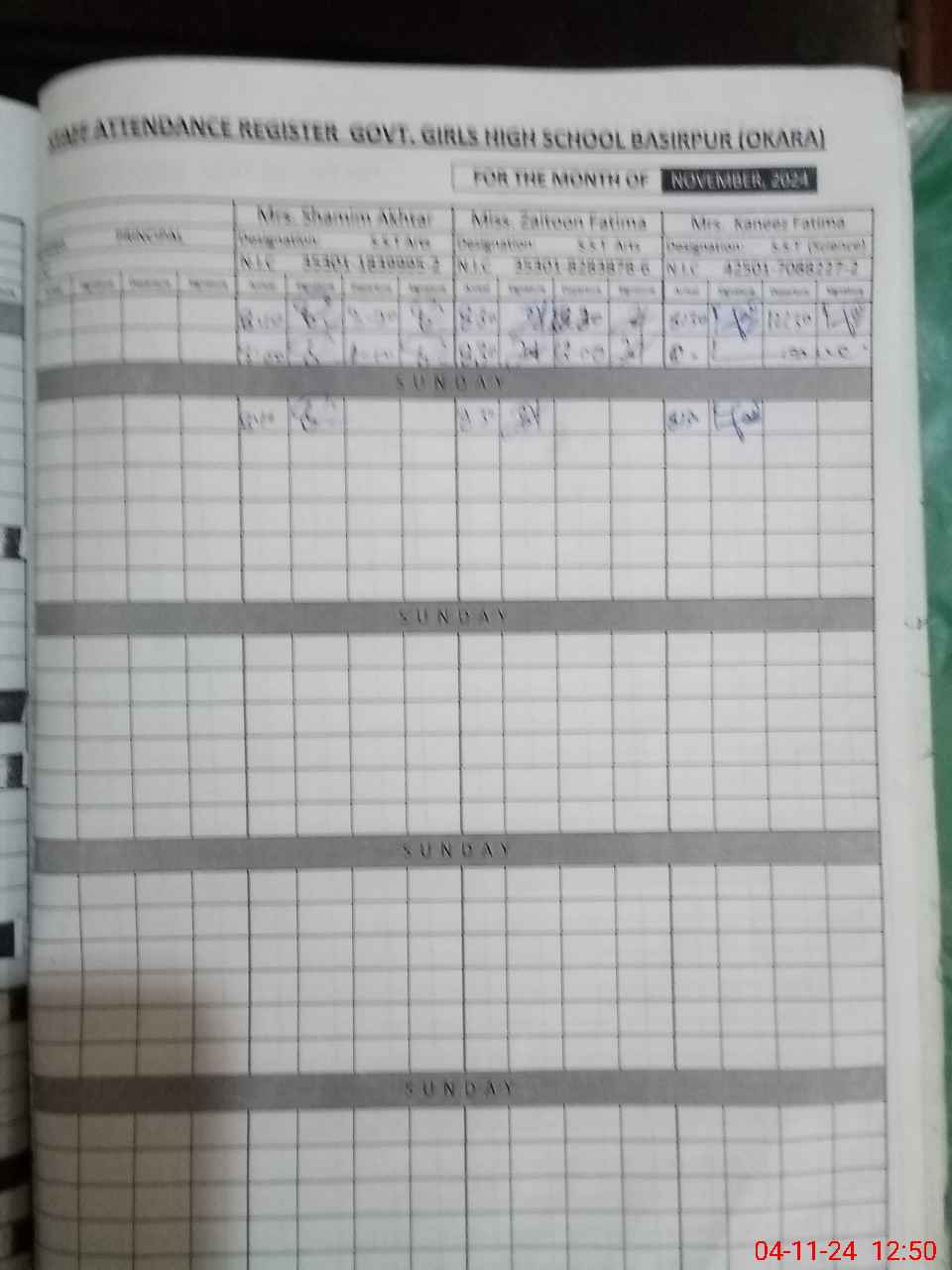| CNIC | Full Name | Designation | R/C | Absence During Last Calender Month |