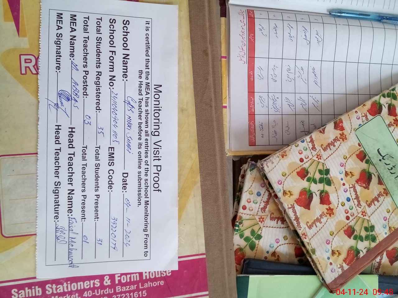 | Attendance Register | Head Teacher | MEA with School | Visit Proof |