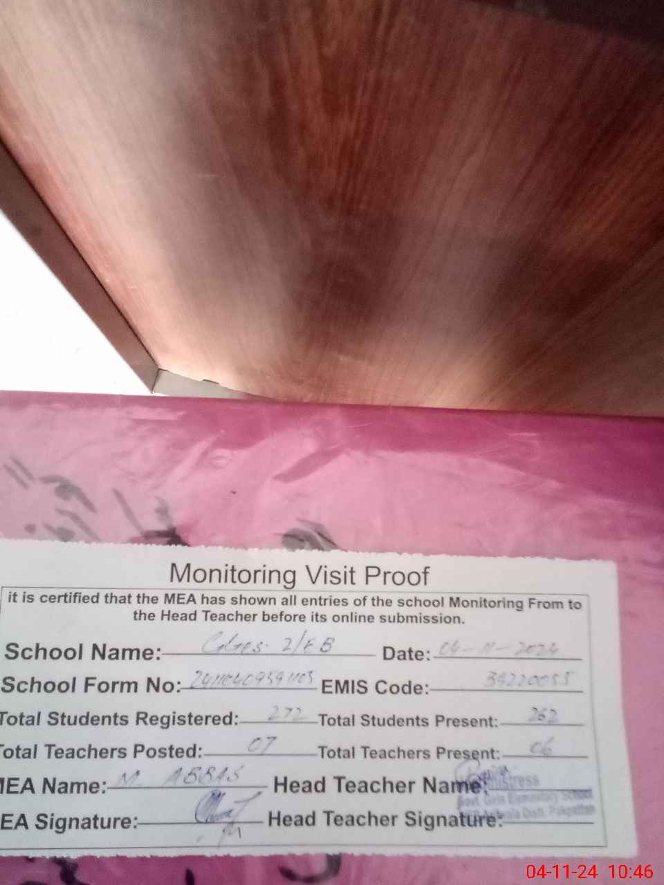 | Attendance Register | Head Teacher | MEA with School | Visit Proof |