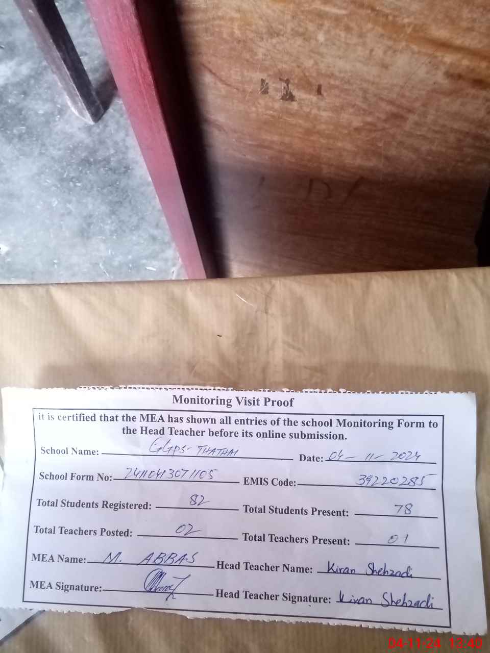 | Attendance Register | Head Teacher | MEA with School | Visit Proof |
