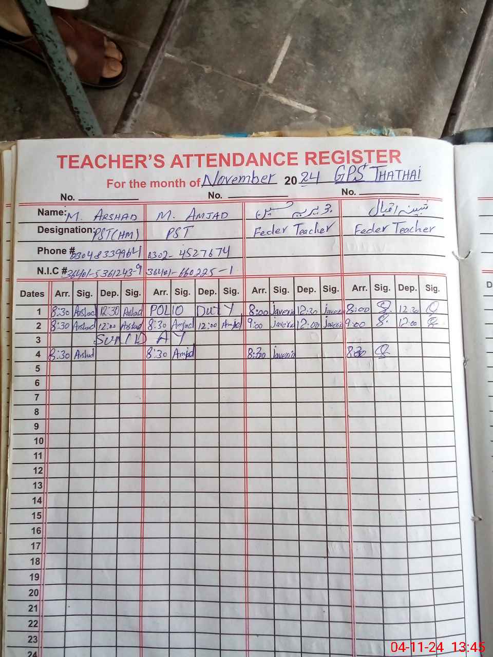 | CNIC | Full Name | Designation | R/C | Absence During Last Calender Month |