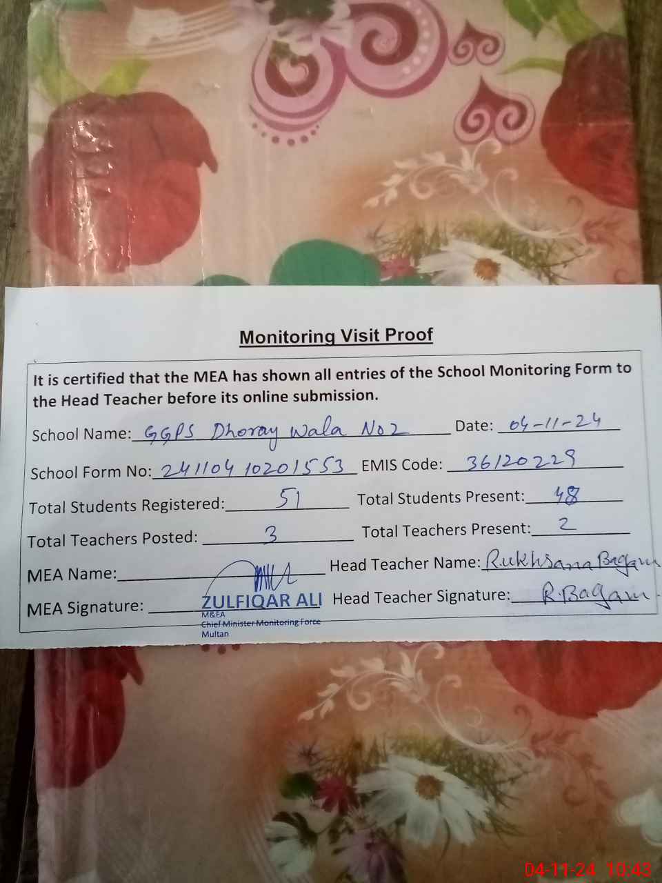 | EMIS Code: 36120229 | Name of School: GGPS DHORAY WALA NO. 2 SHUJABAD | |||