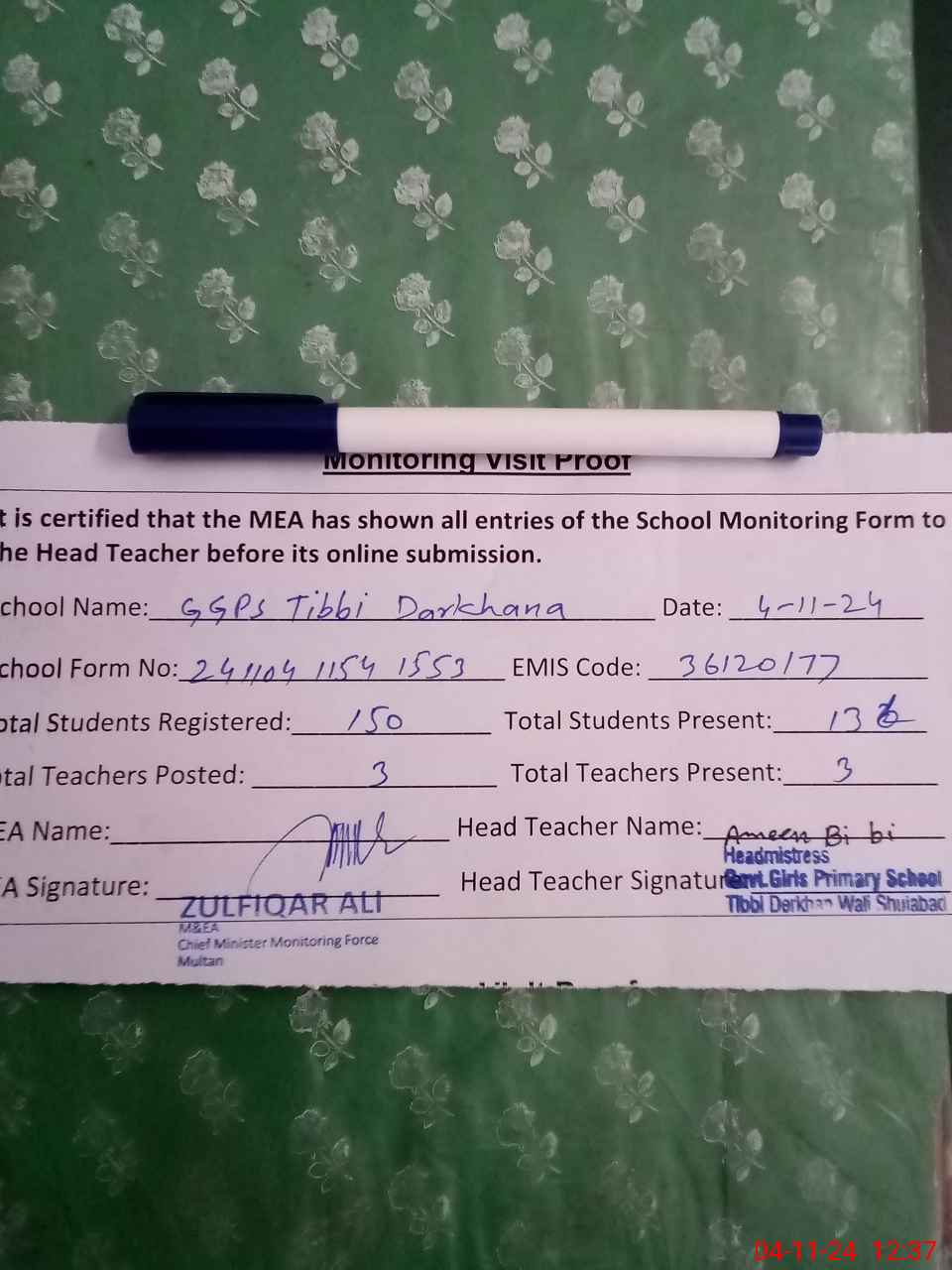 | Attendance Register | Head Teacher | MEA with School | Visit Proof |