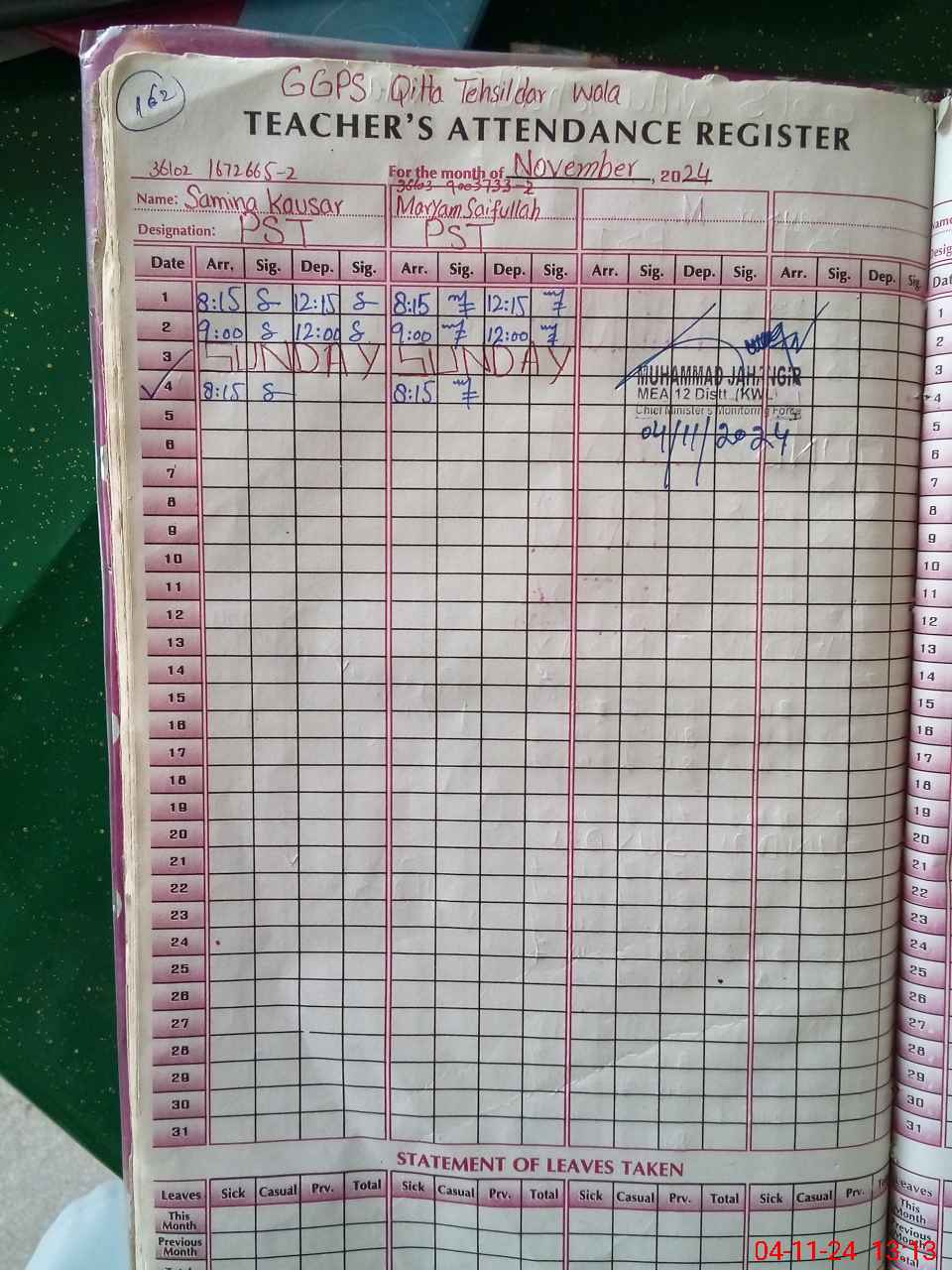 | Remarks (Use Separate Page if Required): FTF RECORDS ARE NOT MAINTAINED BANK STATEMENTS ARE NOT AVAILABLE WASH CLUB RECORDS UPTO 16 NOVEMBER 2023 IS WRITTEN RANDOM CLASS THREE IS NOW PASSED OUT FROM THIS SCHOOL | |||||