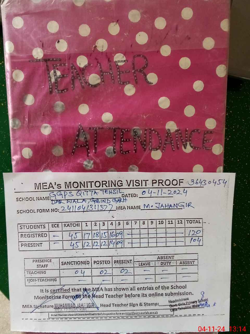 | Attendance Register | Head Teacher | MEA with School | Visit Proof |