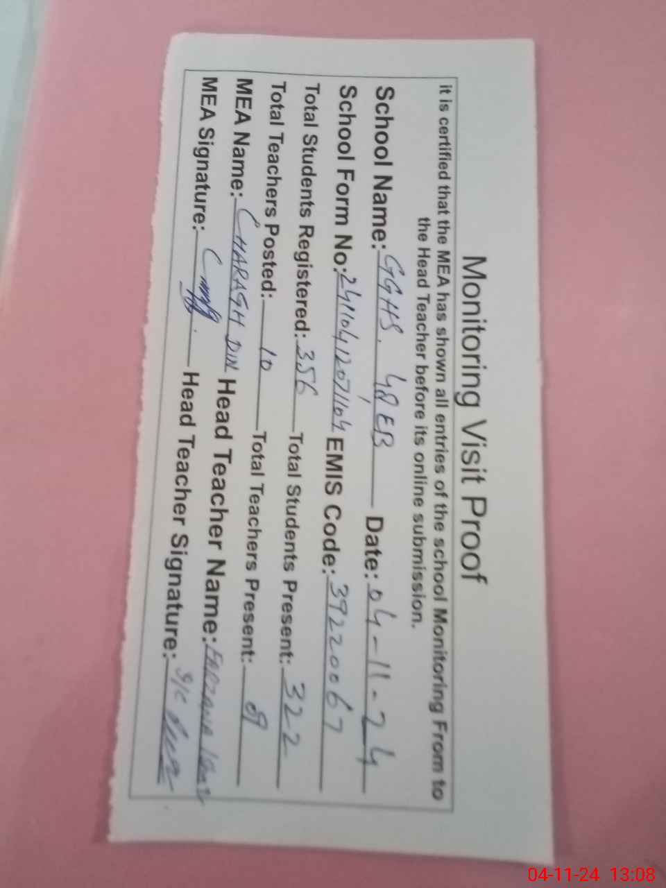 | Attendance Register | Head Teacher | MEA with School | Visit Proof |