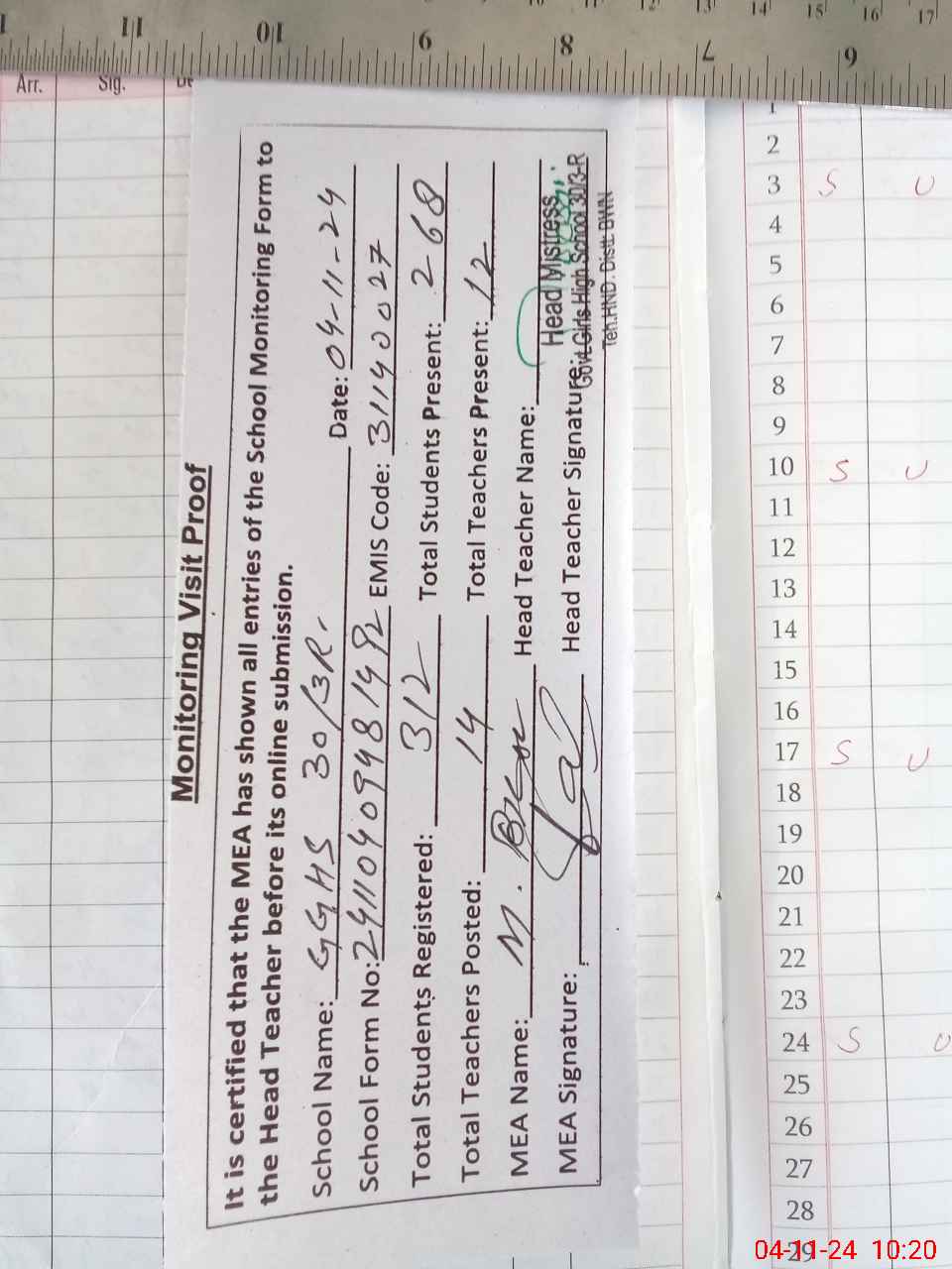 | Attendance Register | Head Teacher | MEA with School | Visit Proof |