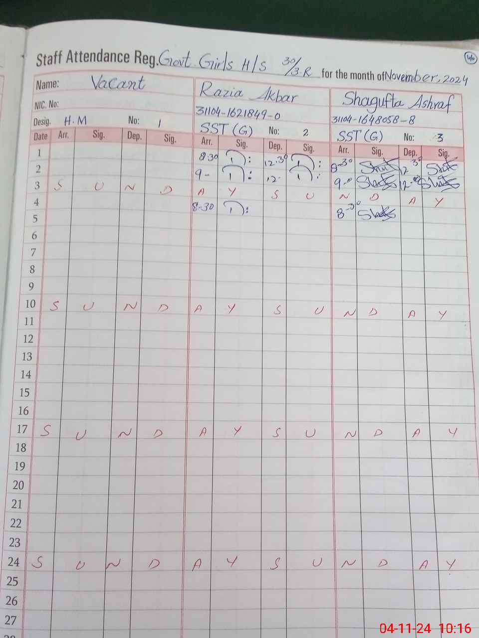 | CNIC | Full Name | Designation | R/C | Absence During Last Calender Month |
