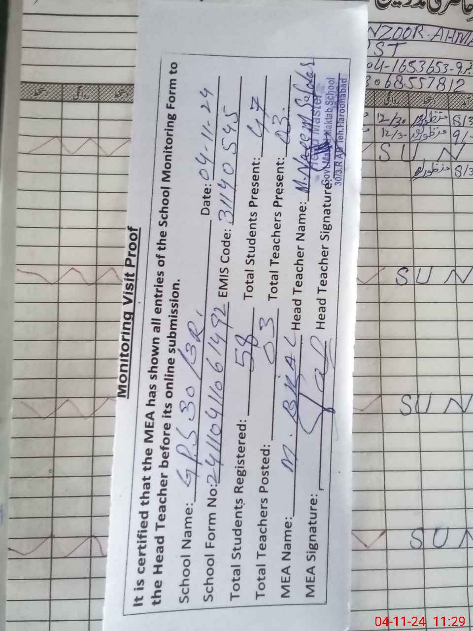| Attendance Register | Head Teacher | MEA with School | Visit Proof |