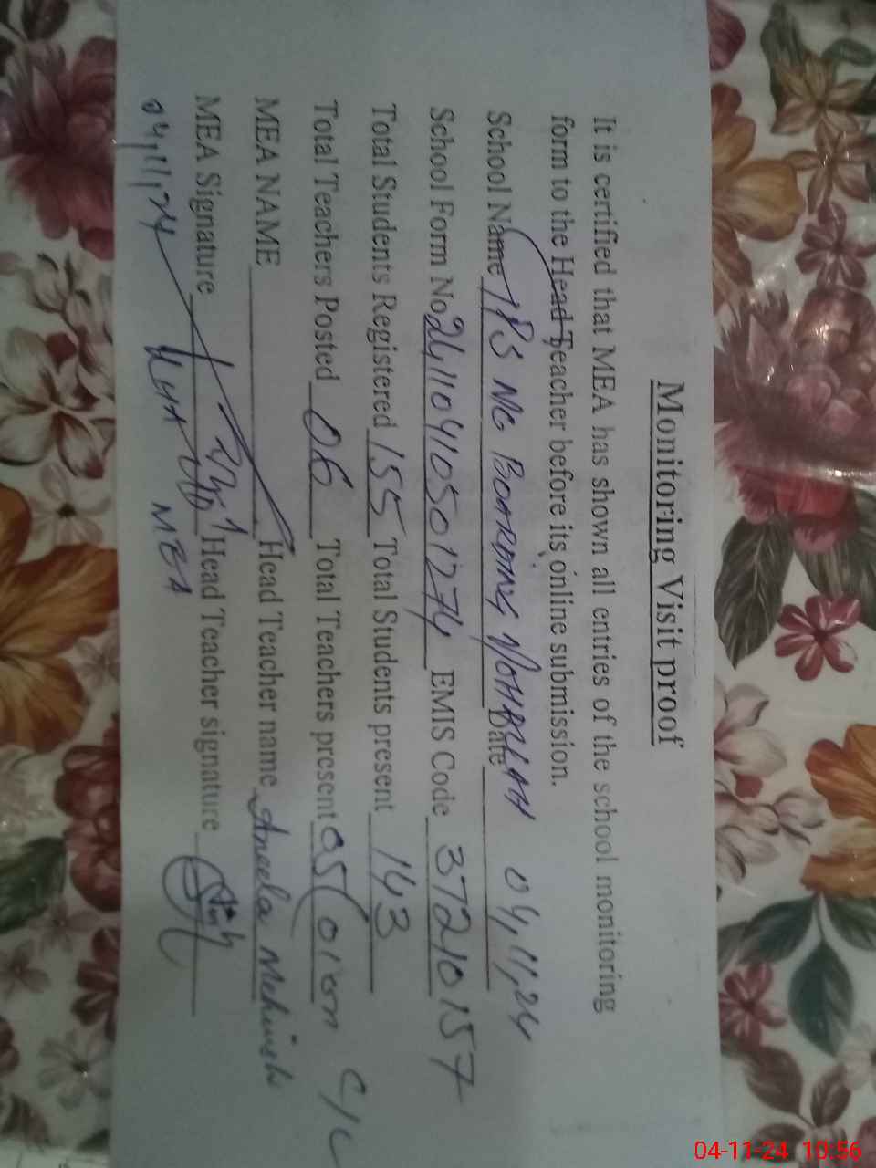 | Attendance Register | Head Teacher | MEA with School | Visit Proof |