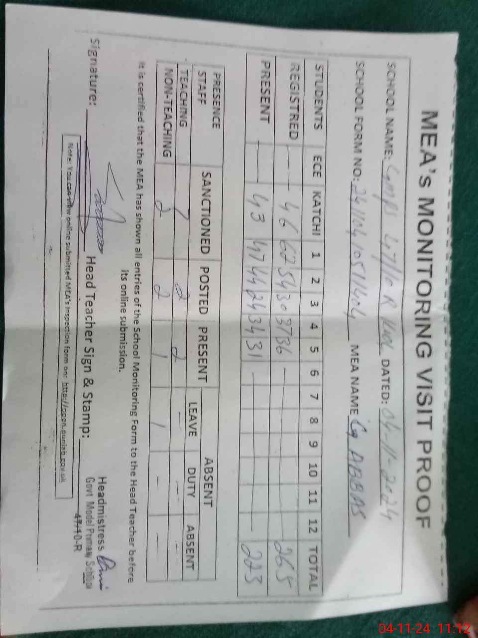 | Attendance Register | Head Teacher | MEA with School | Visit Proof |
