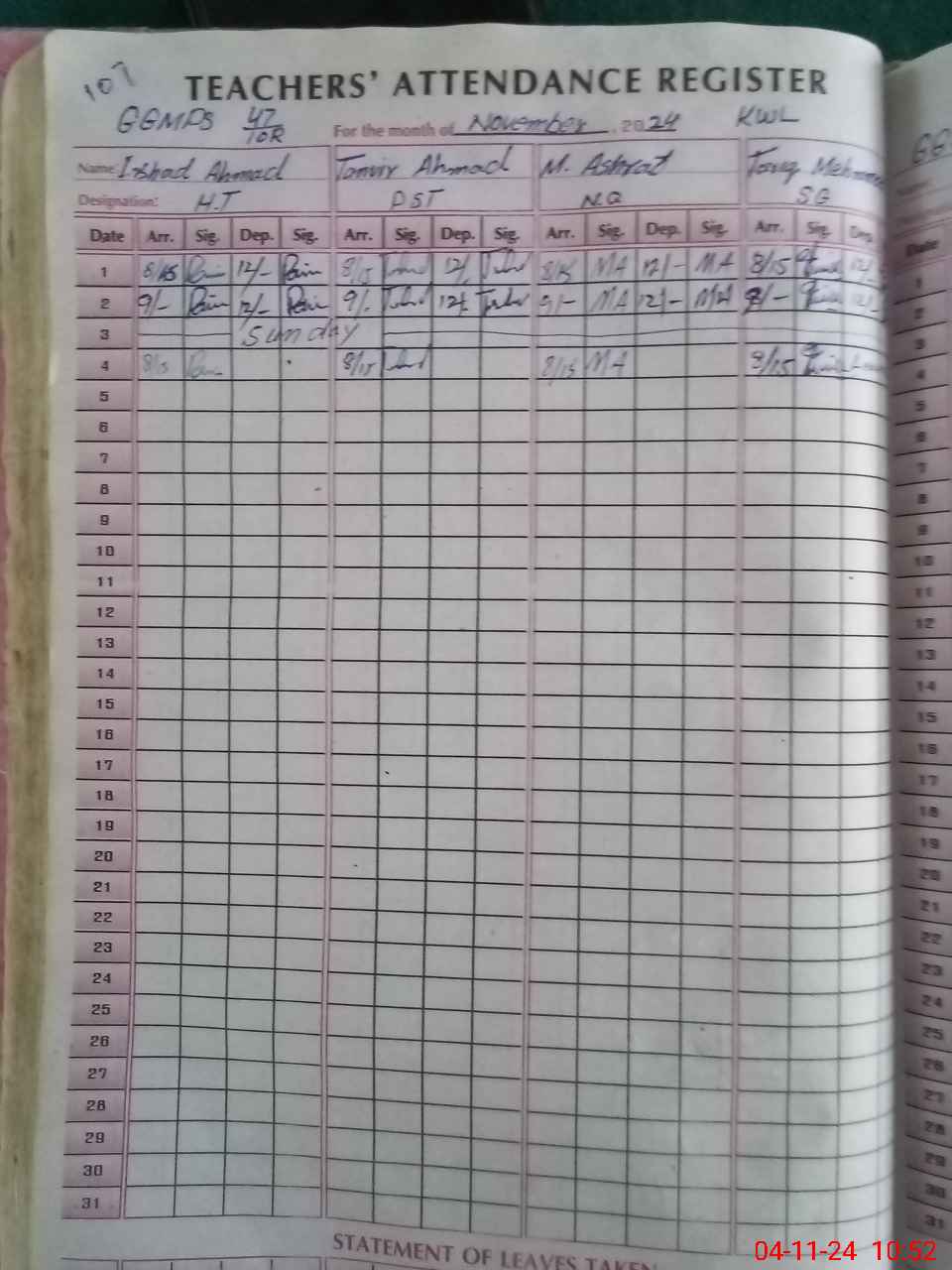 | Leave | Duty | Absent | Maternity | Medical | Ex- Pak |