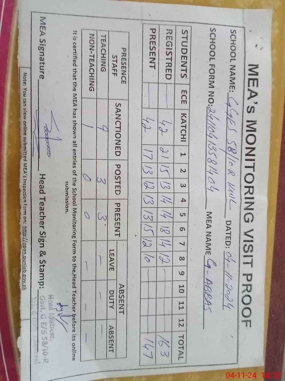 | EMIS Code: 36420404 | Name of School: GGES 58/10-R, KHANEWAL | |||