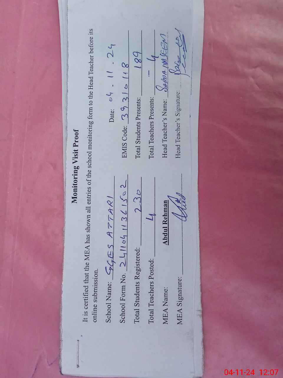| Attendance Register | Head Teacher | MEA with School | Visit Proof |