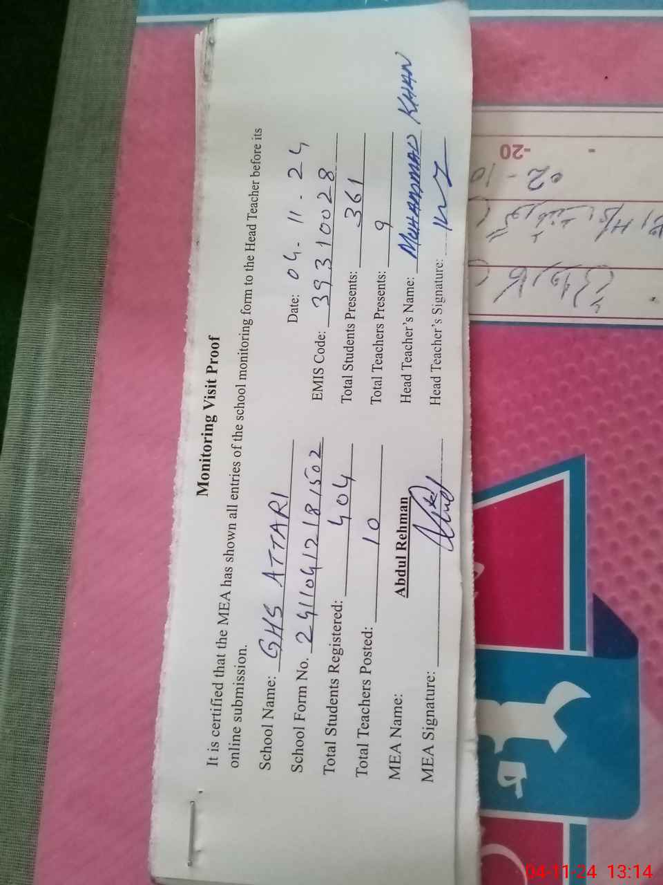 | Attendance Register | Head Teacher | MEA with School | Visit Proof |