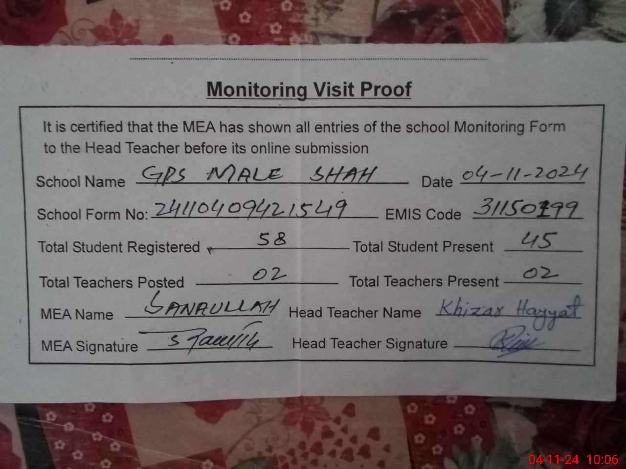 | Attendance Register | Head Teacher | MEA with School | Visit Proof |