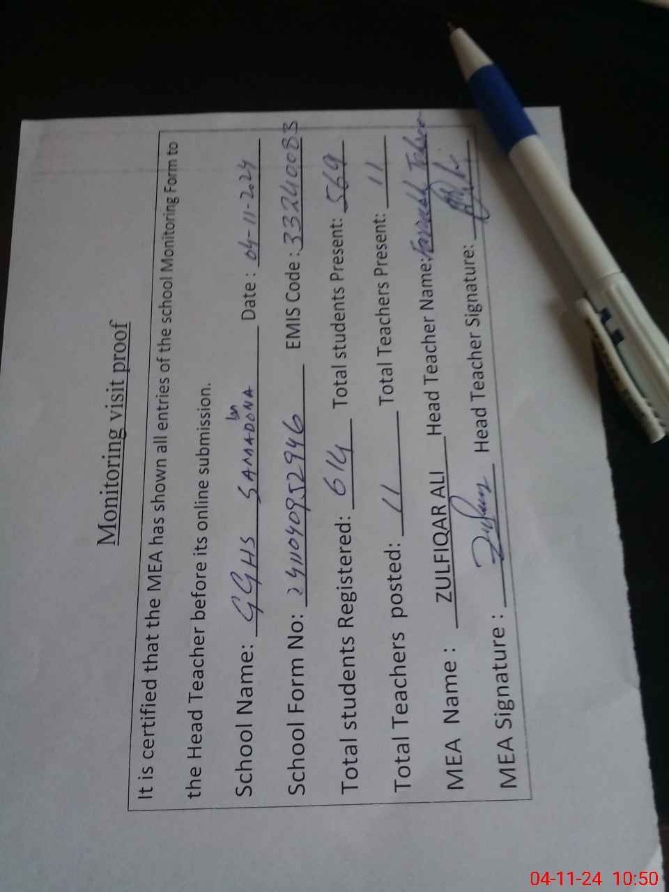 | Attendance Register | Head Teacher | MEA with School | Visit Proof |