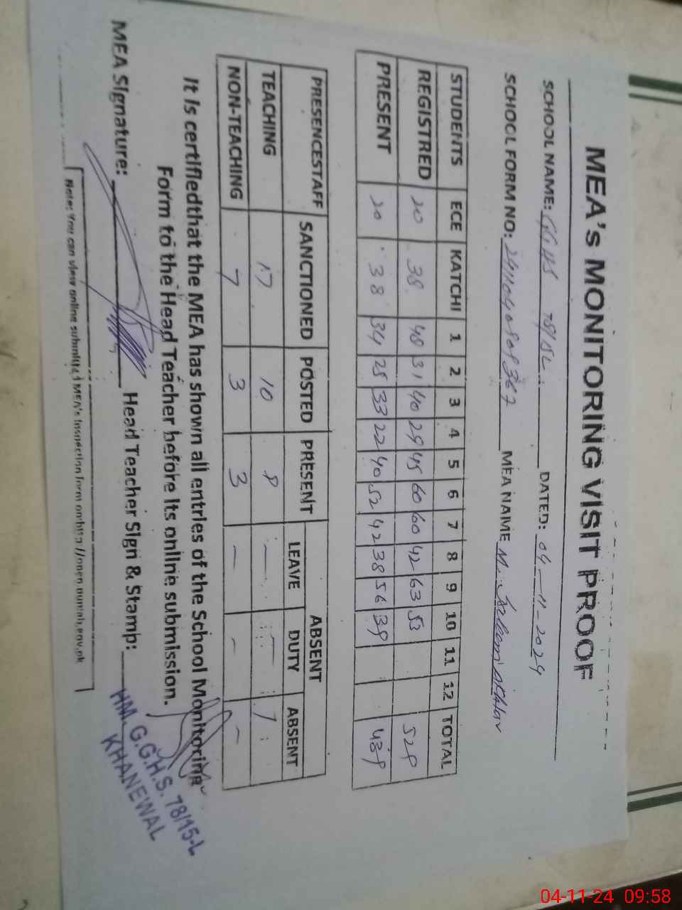 | EMIS Code: 36420657 | Name of School: GGHS 78/15-L, KHANEWAL | |||