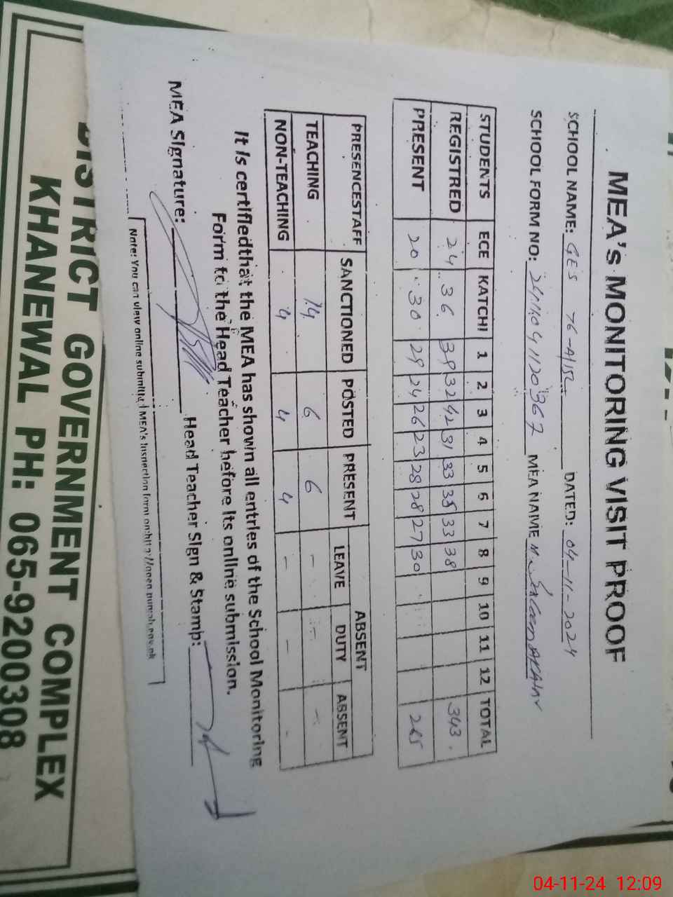 | EMIS Code: 36420654 | Name of School: GES 76-A/15-L, P/O 79/15-L, KHANEWAL | |||